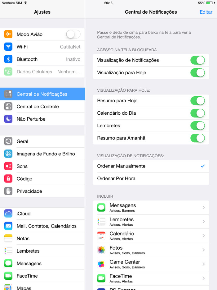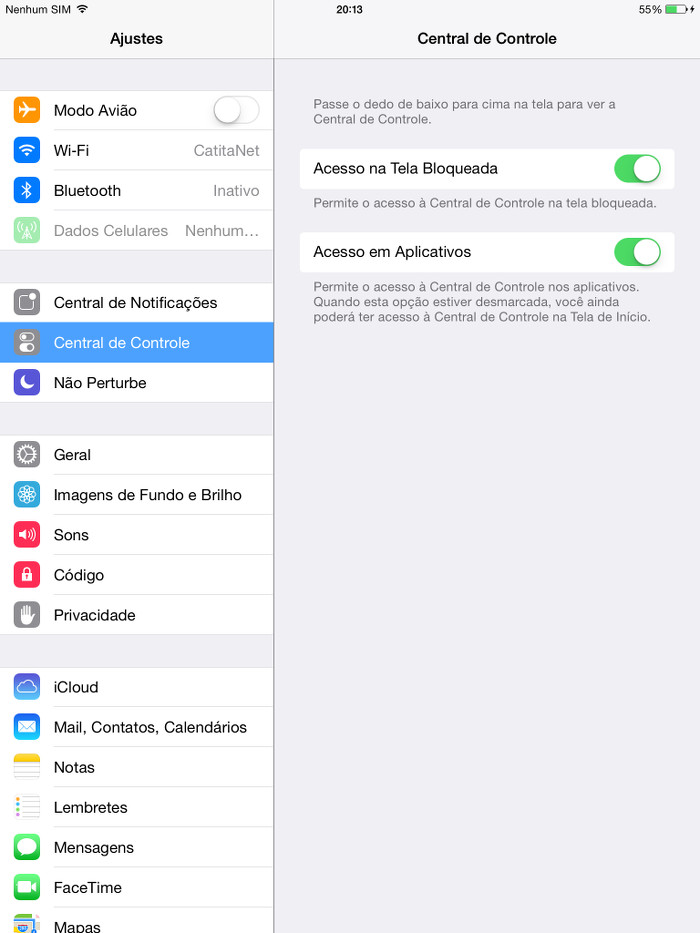 Para a Central de Notificações, o procedimento é similar: Ajustes > Central de Notificações, e desmarque a opção da tela de bloqueio, como no screenshot: