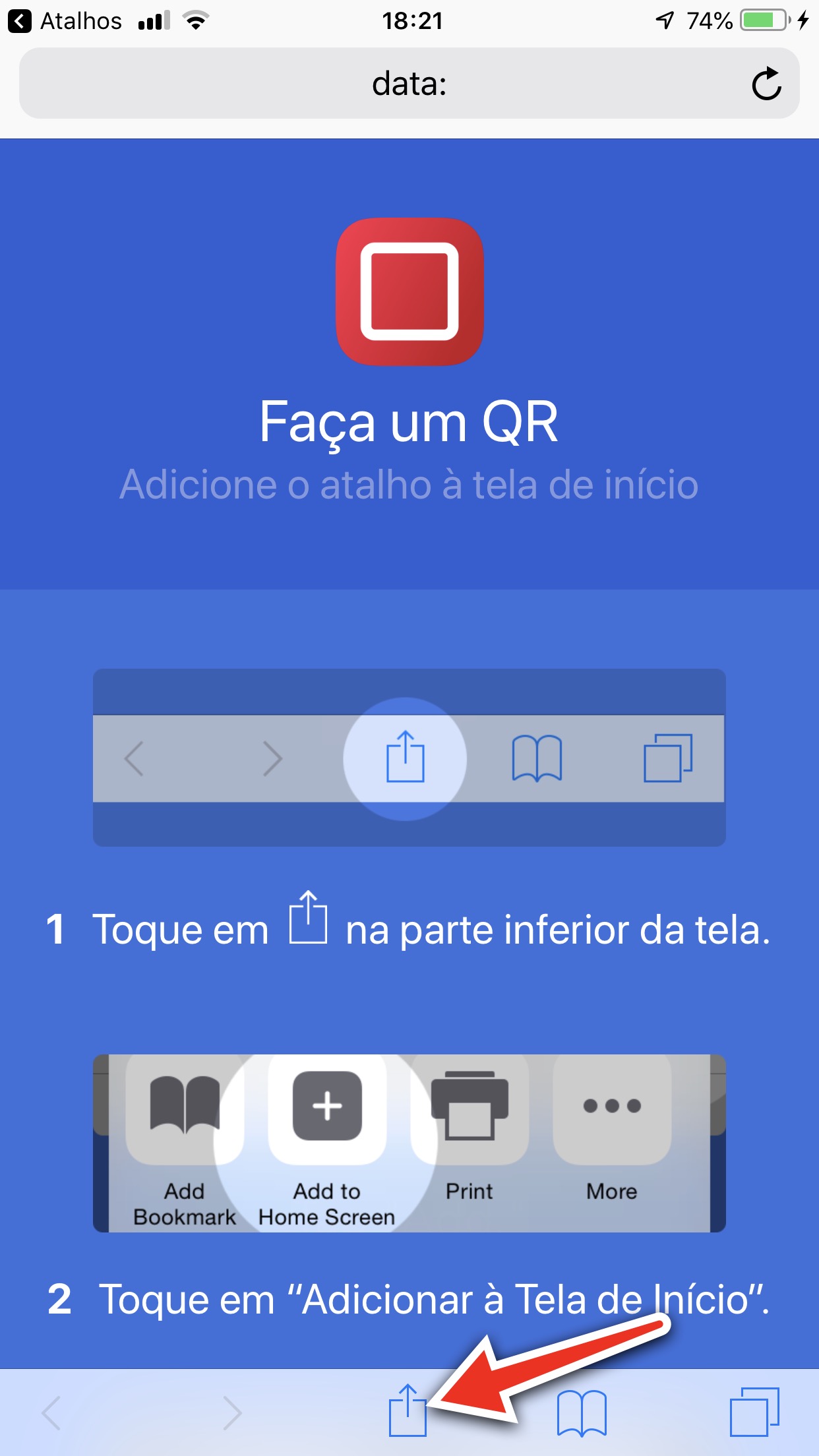 Pelo botão de compartilhamento. Pelo botão de ajustes do atalho. - Uma página será aberta no Safari. Então, toque no botão de compartilhamento e depois em ‘Tela de Início’.