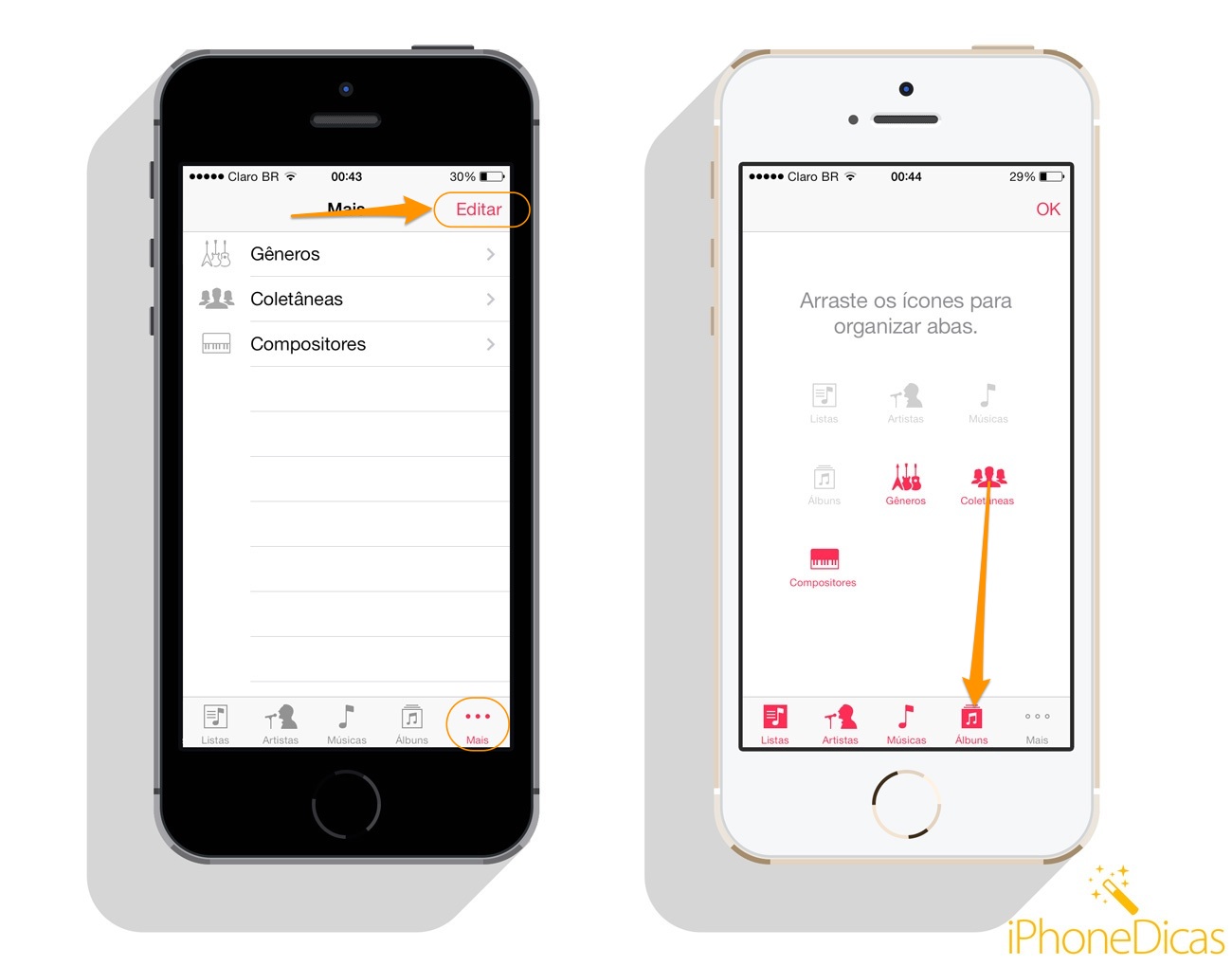 Na primeira imagem você vê as outras abas existentes, que são os Gêneros, Coletâneas e Compositores. Quando você toca em editar, você pode substituir as abas padrões, pelas abas que falei antes. Para isso é só tocar em uma e arrastar para qual você quer substituir, assim como na segunda imagem. Assim você ajusta da forma que você quer.