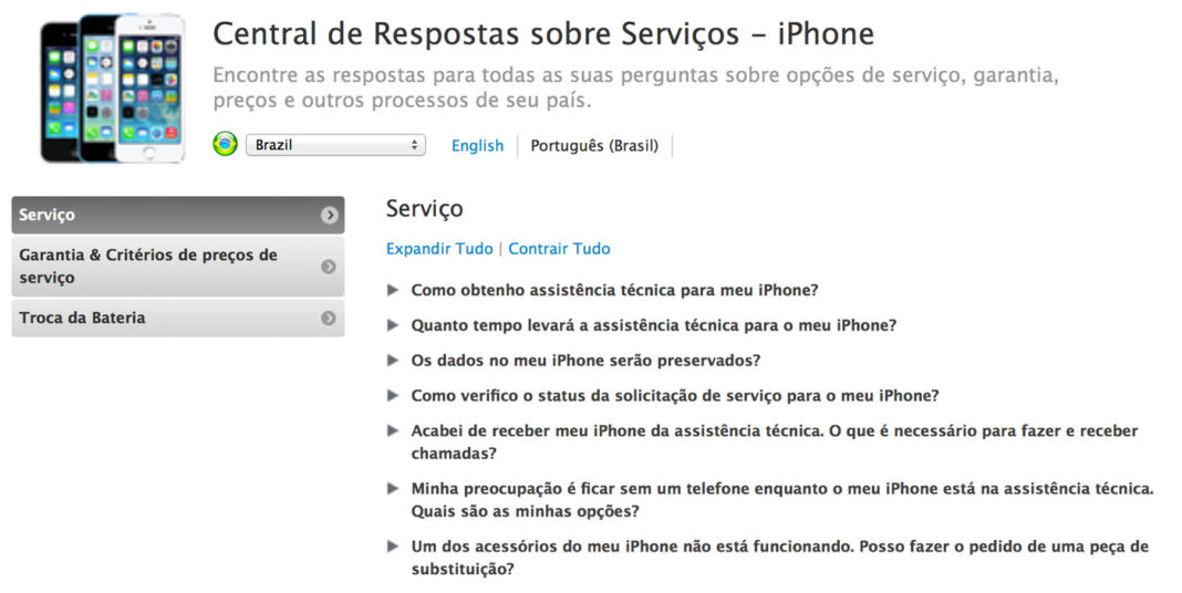 [st_callout title=”Comprou um iPhone 5s ou 5c no exterior?” button_text=”Leia agora mesmo!” link=”http://iphonedicas.com/faq/como-funciona-a-garantia-4g-iphone-5s-comprado-no-exterior/”]Veja como funciona a garantia e o 4G para esses iPhones no Brasil. Veja também em quais países você pode comprar iPhone 5s 100% compatível com o Brasil.[/st_callout]O serviço está anunciado em sua página de suporte e traz uma mudança nas tratativas desse tipo de assistência. Anteriormente os revendedores realizavam suporte somente se ele tivesse qualificado para a garantia e sempre o iPhone inteiro. Os donos de iPhone ficavam relegados a assistências técnicas paralelas ou a alguma técnica Mac Gyver, realizando o conserto de seu aparelho com a ajuda de tutoriais.