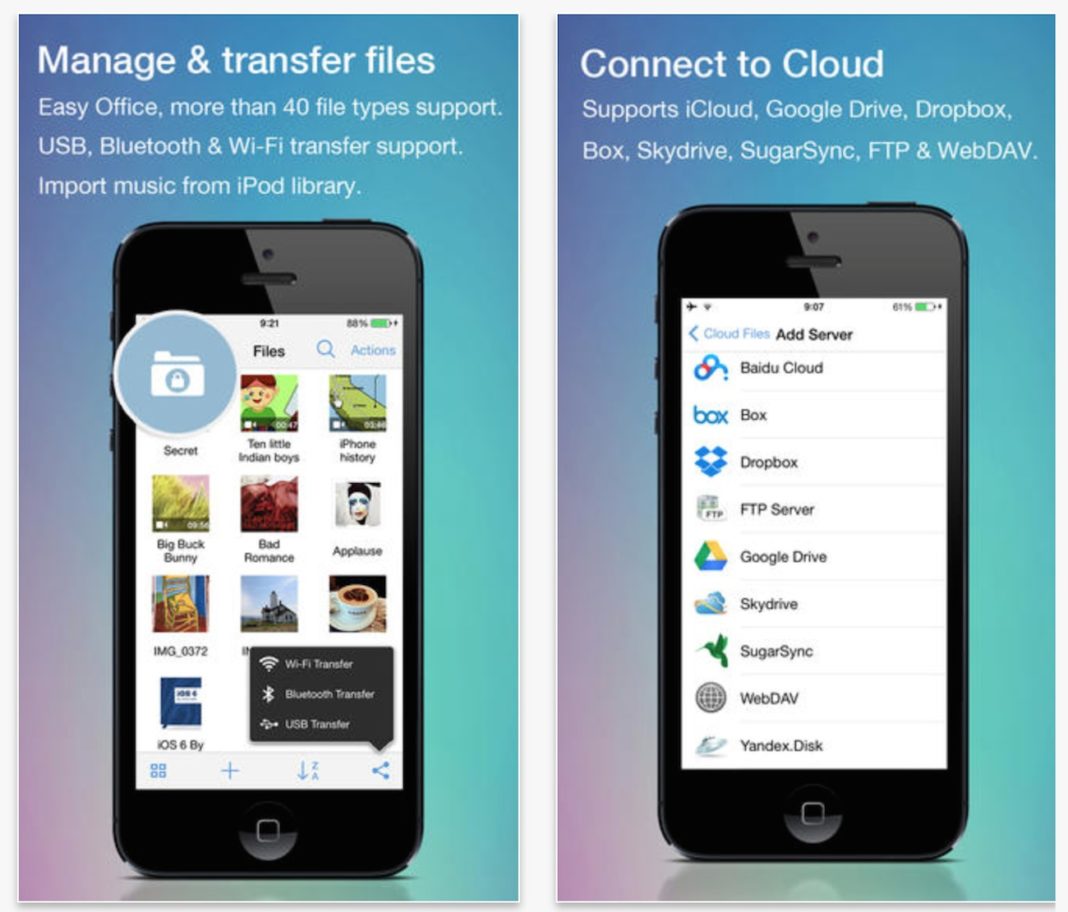 Esse é de longe o aplicativo que mais gostei, tanto que adquiri a versão completa dele. Além de um visual muito intuitivo e bem desenhado para o iOS 7, é compatível com iPhone, iPad e iPod. O que achei mais legal nele é a integração com iCloud, Google drive, Dropbox, Skydrive, SugarSync, Yandex.disk e Baidu, fazendo do meu iPhone realmente um Hub de todos os meus discos além daquela que insiro manualmente.