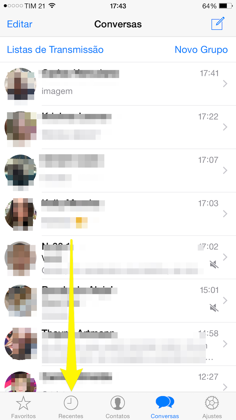 Na tela inicial do WhatsApp, você verá um botão na barra de ícones do rodapé chamado “Recentes”. Ali aparece a lista de todas as ligações efetuadas, recebidas e perdidas.