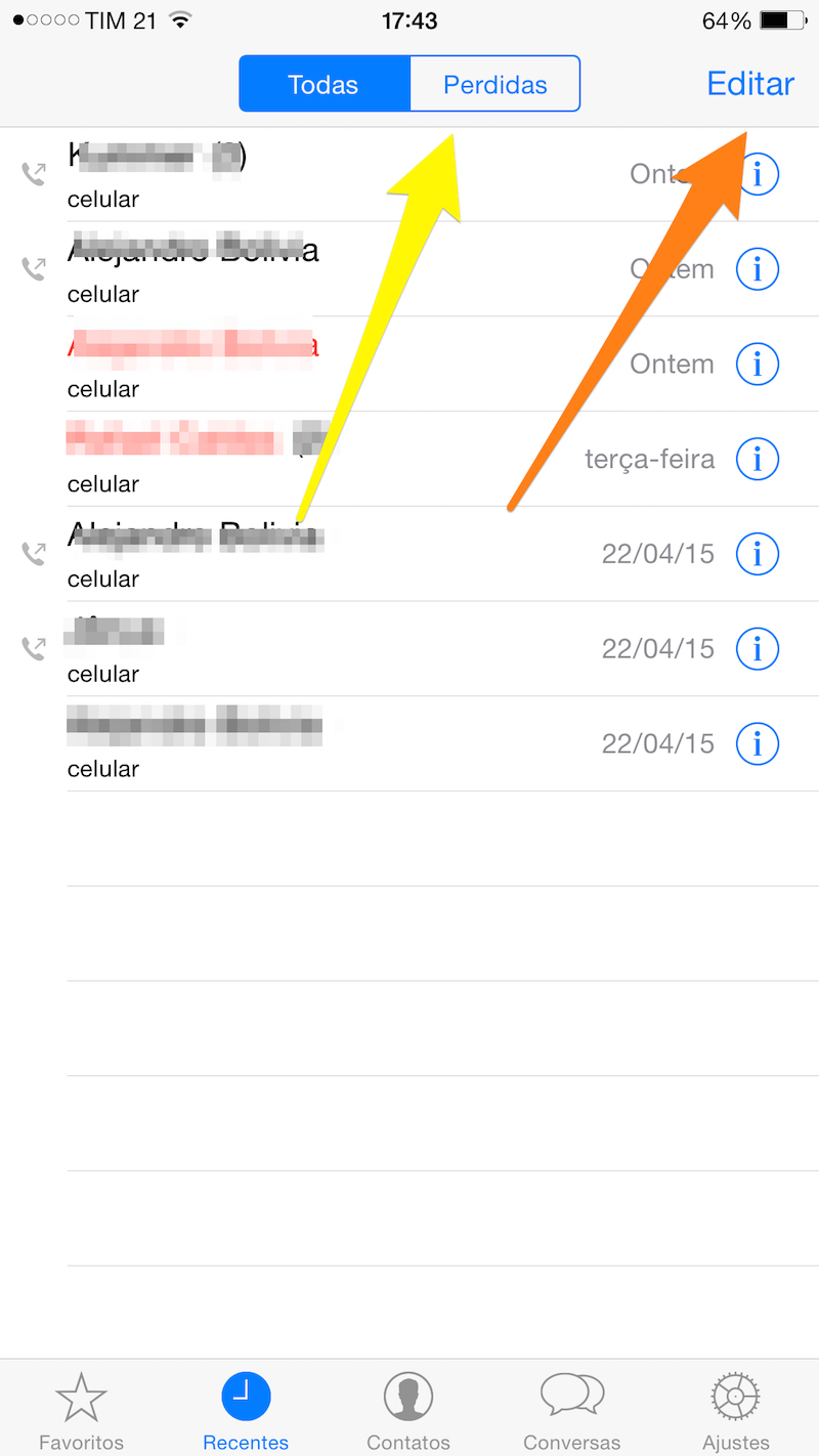 Caso queira ver apenas as chamadas perdidas, basta tocar na guia correspondente no topo da tela. Para apagar algum registro, toque em “Editar” e em seguida, no botão vermelho.